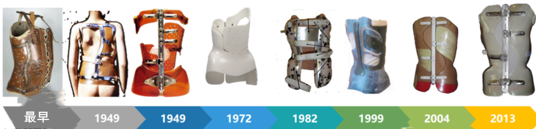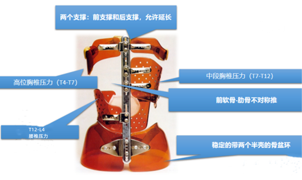 Lyon(里昂)矯形器有前后支撐桿,并可以延長(zhǎng),在胸段、腰段都有可調(diào)節(jié)的壓力,并在前側(cè)肋骨給予不對(duì)稱的推力,在骨盆處有兩個(gè)半殼對(duì)骨盆進(jìn)行穩(wěn)定。這是LYON方法中知名度最高,最具代表性的一款矯形器。